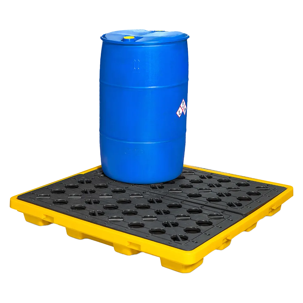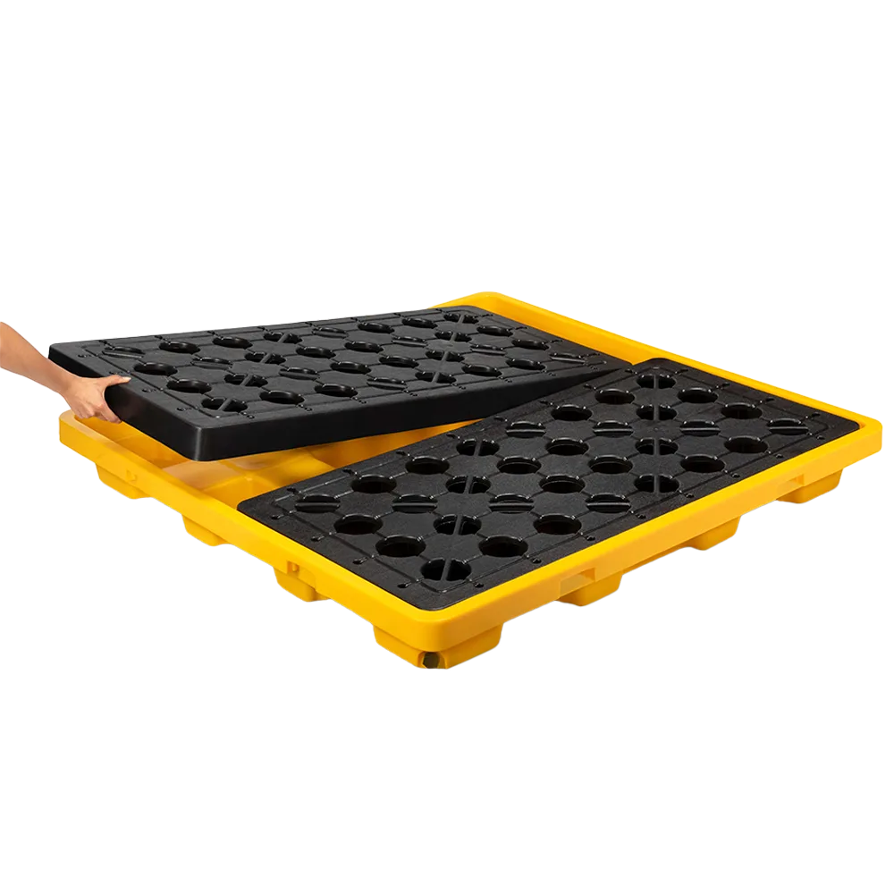 Estiba antiderrame plástica contenedora de líquidos, fabricada en polietileno, para 4 bidones. Incluye: